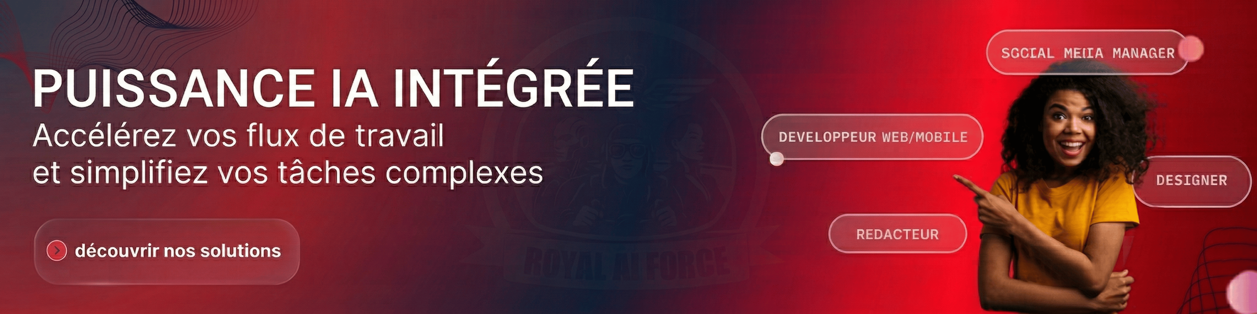 Chez Royal AI Force, nous déployons des experts ultra-spécialisés : Générateur/Monteur vidéo IA (Elevenlabs, Arcade, VEO), des Intégrateurs d'Automatisations IA (N8N, MAKE, ZAPIER) pour vos flux complexes, des développeurs d'agents IA (CLAUDE, N8N, OPENCLAW). Ils démultiplient votre vitesse d'exécution et intègrent l'innovation au cœur de vos process.